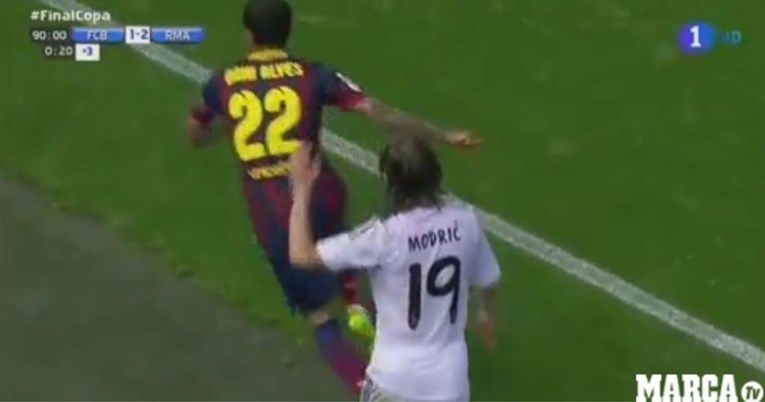 ‘Društvene mreže prisjetile su se ovog trenutka Clasica u kojem je Dani Alves bacio loptu Luki Modriću u lice. Alves nije dobio ni žuti karton, a Modrić je ispao džentlmen’, piše Marca uz priloženi video iz 2014. godine.