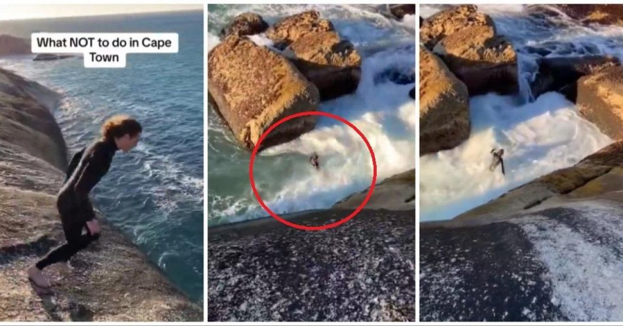 Milijuni ljudi pogledali su snimku koja stiže iz južnoafričkog Cape Towna, piše Jutarnji.hr. Na plaži Llandundo, nesmotreni adrenalinski ovisnik skočio je s granitne gromade visoke 11 metara u relativno mirno more koje se u sekundi uzburkalo noseći ga prema opasnim stijenama, prenosi Daily Mail.