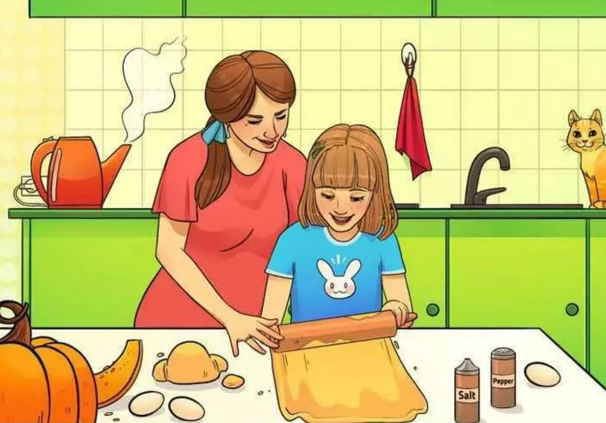 Pred vama je ilustracija na kojoj mama i kćer zajedno pripremaju pitu od bundeve, baš na vrijeme za Noć vještica. Zelena kuhinja izgleda neobično, stol je prekriven sastojcima, a nestašna mačka skače po radnim pločama dok u pozadini kuhalo za vodu vrije.
