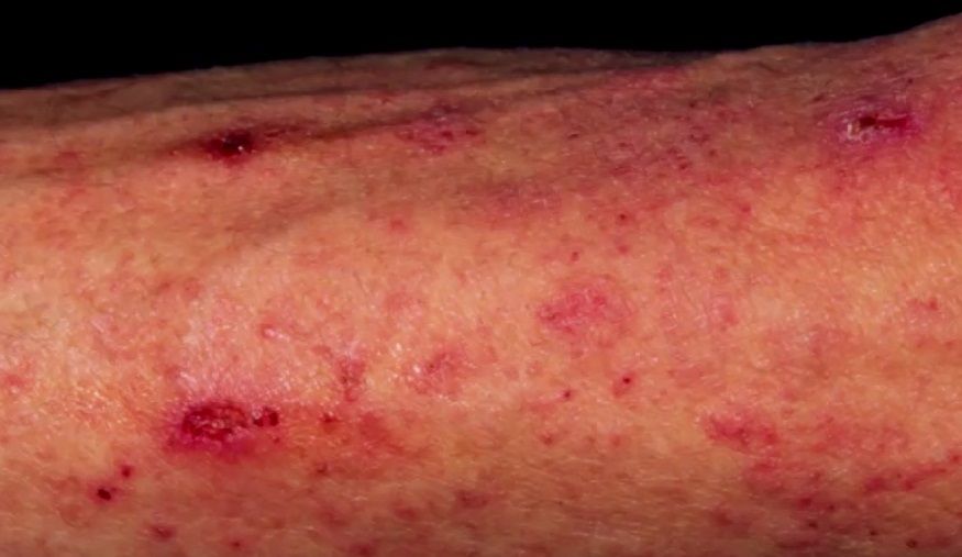 Bolest se klinički manifestira intenzivnim svrbežom, posebno noću, te pojavom kožnih promjena lokaliziranih na specifičnim dijelovima tijela, kao što su: