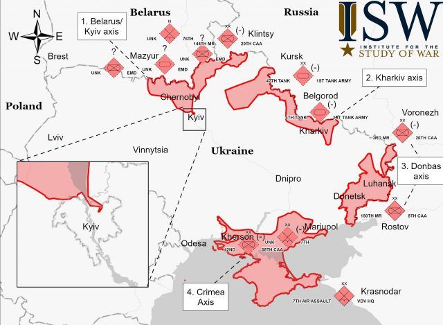NEW #Ukraine Conflict Update: #Russian forces’ main axes of advance in the last 24 hours focused on #Kyiv, northeastern Ukraine, and southern Ukraine; Ukrainian resistance remains remarkably effective. https://t.co/EK9FwIGTKz pic.twitter.com/M9WOnX9mgk