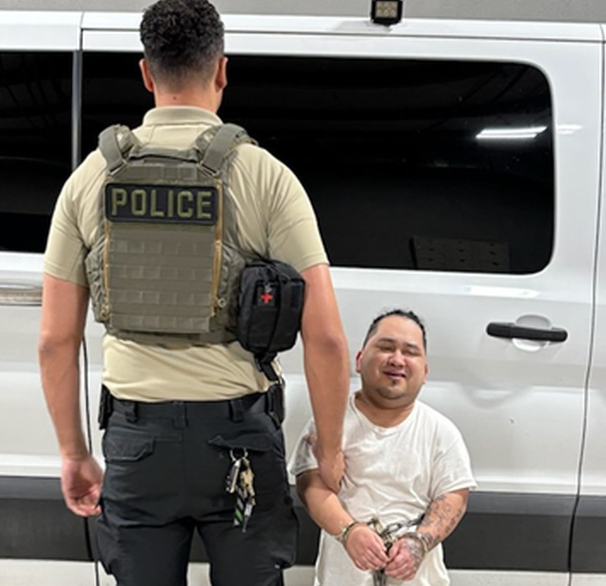Na fotografiji se vidi Soto-Galeano s lisicama na rukama i nogama, dok se smije u kameru. Pored njega stoji agent ICE-a okrenut leđima, a uhićenik mu doseže tek do struka, što je izazvalo brojne komentare na internetu.
