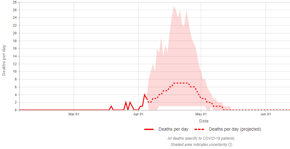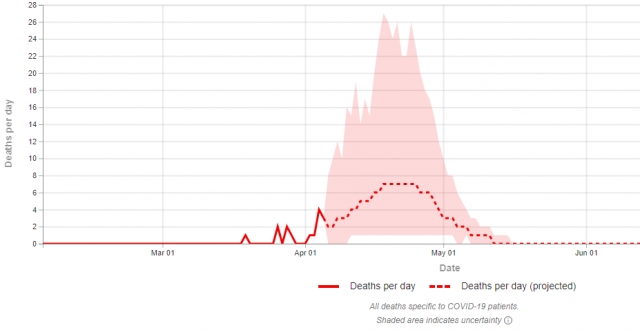 Prestižni američki Institut za metriku i procjene u zdravstvu (IHME) pri Sveučilištu Washington za Hrvatsku predviđa vrhunac epidemije koronavirusa krajem travnja. Prema istoj procjeni, u našoj zemlji bi zbog bolesti COVID-19 trebalo umrijeti između 166 pacijenata (minimalno 120, maksimalno 240)