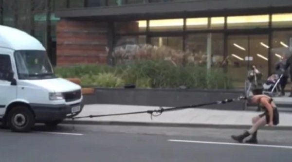 Tridesetčetverogodišnja stanovnica Londona Anastasia Savicka iznenadila je prolaznike izložbom tijekom koje je povukla kombi sa svezanom kosom.