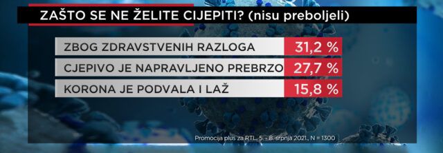 Kod onih koji se nisu cijepili, a nisu niti preboljeli koronu, ključni argument zašto se ne žele cijepiti navode moguće nuspojave. Takvih je gotovo trećina ili 31.2 posto. Više od četvrtine (27.7 posto) smatra da je cjepivo nesigurno, dok 15.8 posto tvrdi da je korona laž ili da se preuveličava opasnost od ove zarazne bolesti koja je paralizirala svijet.