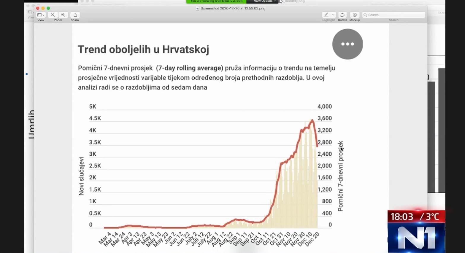 “To je vrlo pozitivan rezultat, mjere očigledno djeluju”, rekao je znanstvenik Ivan Đikić i dodao: “Na ovoj tablici vidite uistinu jako lijepo da smo prije tjedan dana bili na 3.600 sedmodnevnog prosjeka, danas smo na 2.800. To je ogromni pad, značajan. Međutim, ono što je jako važno da se ne fokusiramo samo na novozaražene, nego da gledamo preminule. Vidite da u Hrvatskoj taj trend i dalje raste nesmetano.”