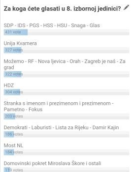 U proteklih tjedan dana preko 2.300 posjetitelja našeg portala glasalo je u online anketi za 20 lista prijavljenih za parlamentarne izbore u VIII. izbornoj jedinici. Najviše glasova dobila je SDP koalicija, ukupno 19%, slijedi s 14% Unija Kvarnera koju u stopu prati lijeva koalicija Možemo i Radničke fronte koja ima isti postotak. Na četvrtom mjestu je HDZ s 13% te koalicija Pametno i Stranka s imenom i prezimenom koja je dobila 9 posto. Među opcijama s većim brojem dobivenih glasova je i koalicija Liste za Rijeku, Demokrata i nezavisnog Kajina koja je s 8 posto na šestom mjestu od ukupno 20 lista za koje se moglo glasati u našoj anketi.