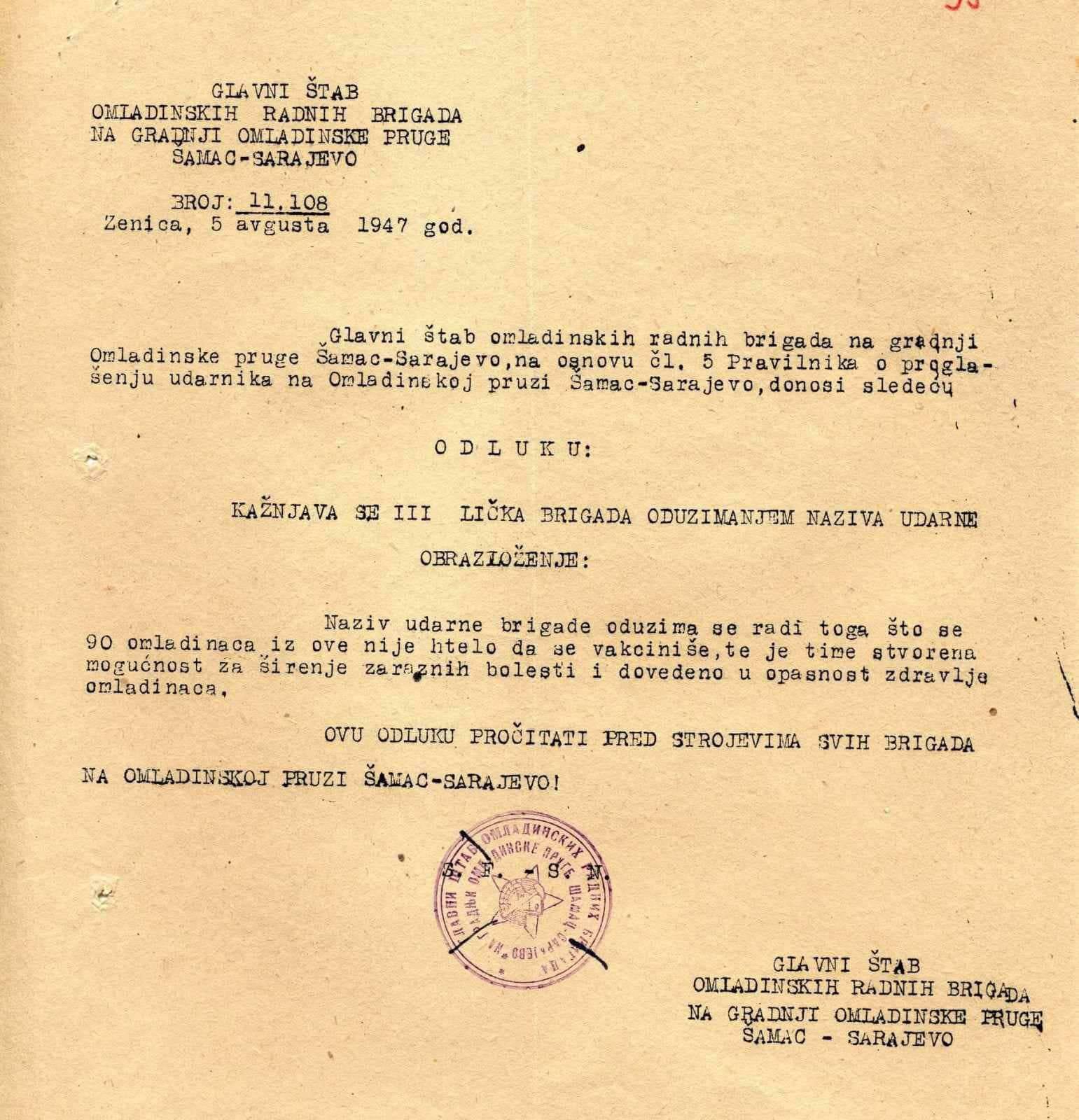 “Naziv udarne brigade oduzima se radi toga što se 90 omladinaca iz ove nije htjelo da se vakciniše, te je time stvorena mogućnost za širenje zaraznih bolesti i dovedeno u opasnost zdravlje omladinaca.”