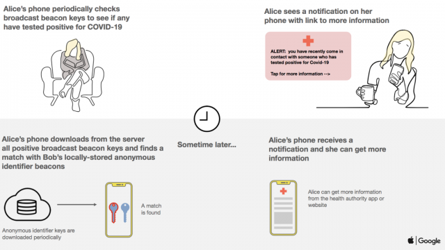 Ako nekom korisniku bude dijagnosticirana zaraza, taj će podatak moći unijeti u aplikaciju, nakon čega će obavijest o mogućem fizičkom kontaktu dobiti svi korisnici kojima je bio u blizini, u posljednjih 14 dana. Dakle, ako ste se našli pored nekog kome je ustanovljena zaraza, dobit ćete obavijest o tome. Nećete znati o kome se točno radi, ali ćete pravovremeno znati da biste se možda trebali testirati ili samoizolirati. Kompanije kažu kako su poduzeli niz koraka da zaštite privatnost korisnika.