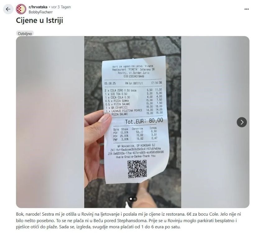 Na Redditu je jedan Hrvat podijelio iskustvo svoje sestre koja je ljetovala u Rovinju: “Šest eura za bocu Cole. Jelo nije ni bilo nešto posebno. To se ne plaća ni u Beču pored Stephansdoma.”