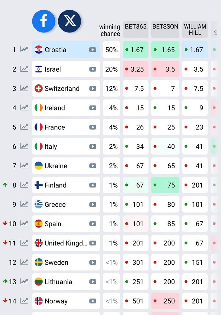 Baby Lasagna zadivio je kladioničare diljem svijeta svojim brzim usponom na kladionicama za pobjedu na Eurosongu. Iznenadna promjena prognoza pokazuje da su njegove šanse za osvajanje titule porasle na impresivnih 50%.
