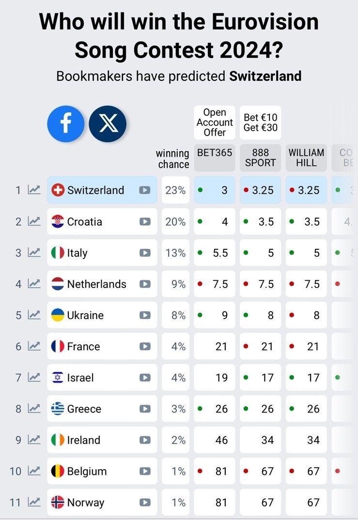 Nakon druge probe za nastup na Eurosongu, Baby Lasagna se brzo počeo penjati prema vrhu kladionica. Prije druge probe, Baby Lasagna je imao 17% šanse za pobjedu, ali u proteklih nekoliko sati, ta je šansa porasla na 20%. Švicarska, koja je do tada držala visoku poziciju, lagano pada, dok Hrvatska raste i postoji velika mogućnost da će Baby Lasagna do sutra zauzeti vrh kladionica.