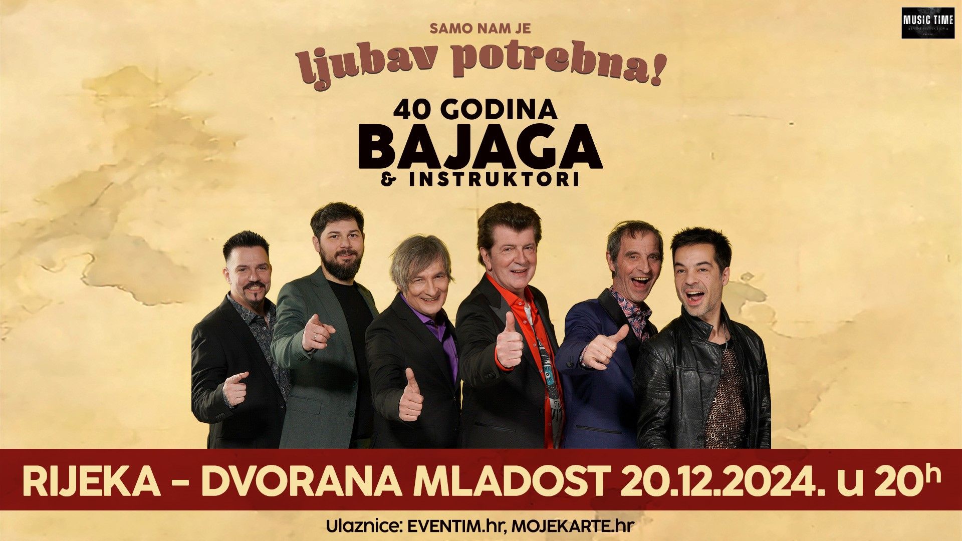 U sklopu velike slavljeničke koncertne turneje “Samo nam je ljubav potrebna” kojom bend proslavlja 40 godina postojanja, Bajaga i Instruktori održat će koncert i u Rijeci, u Dvorani mladost, 20. prosinca.