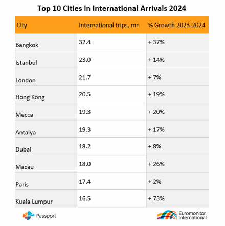Ovo je značajan porast za Bangkok, s rastom od čak 37% u odnosu na prethodnu godinu. Prošlogodišnji prvak, Istanbul, ove godine zauzima drugo mjesto s 23 milijuna dolazaka, što ga i dalje čini jednim od najpopularnijih gradova svijeta.