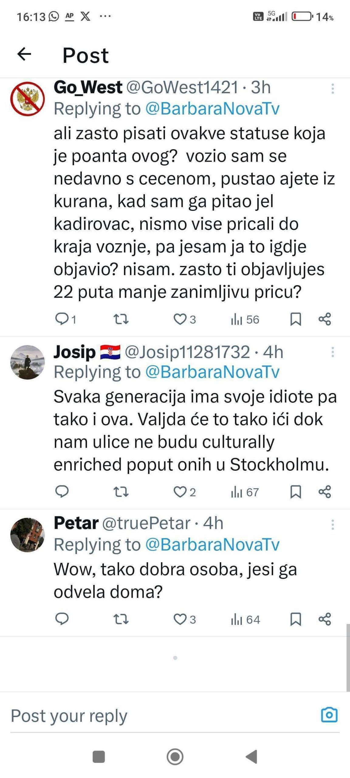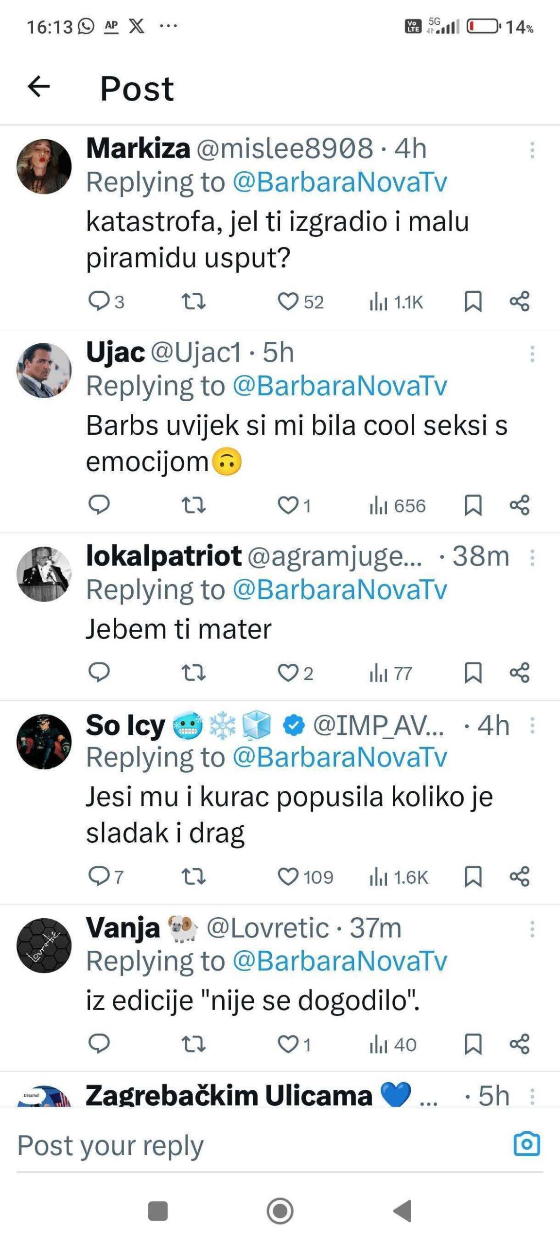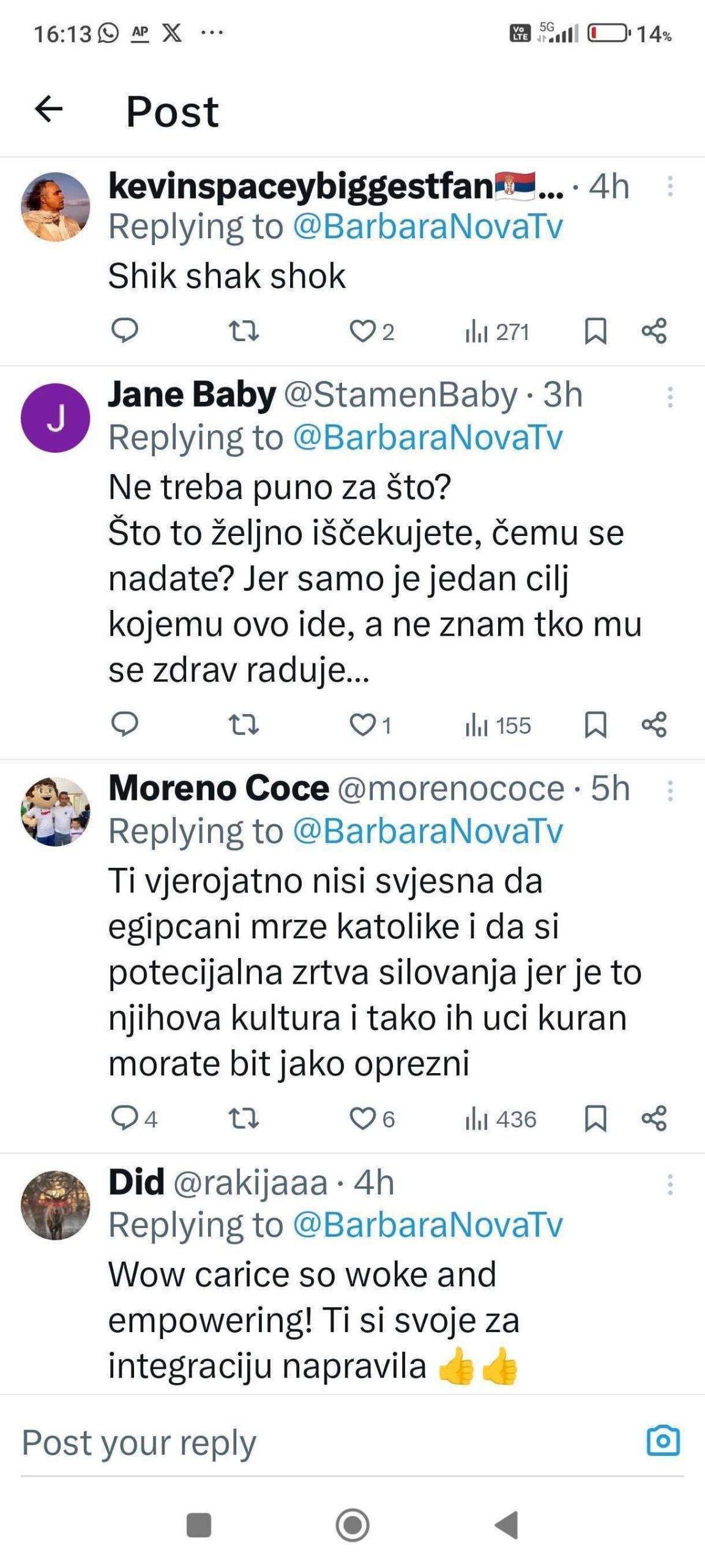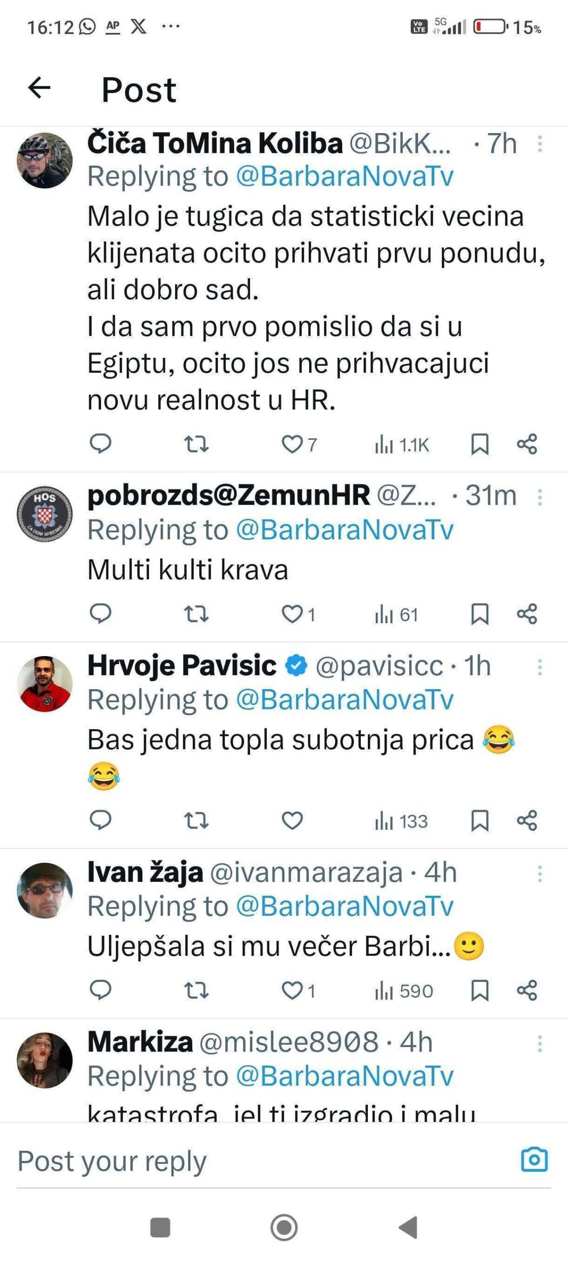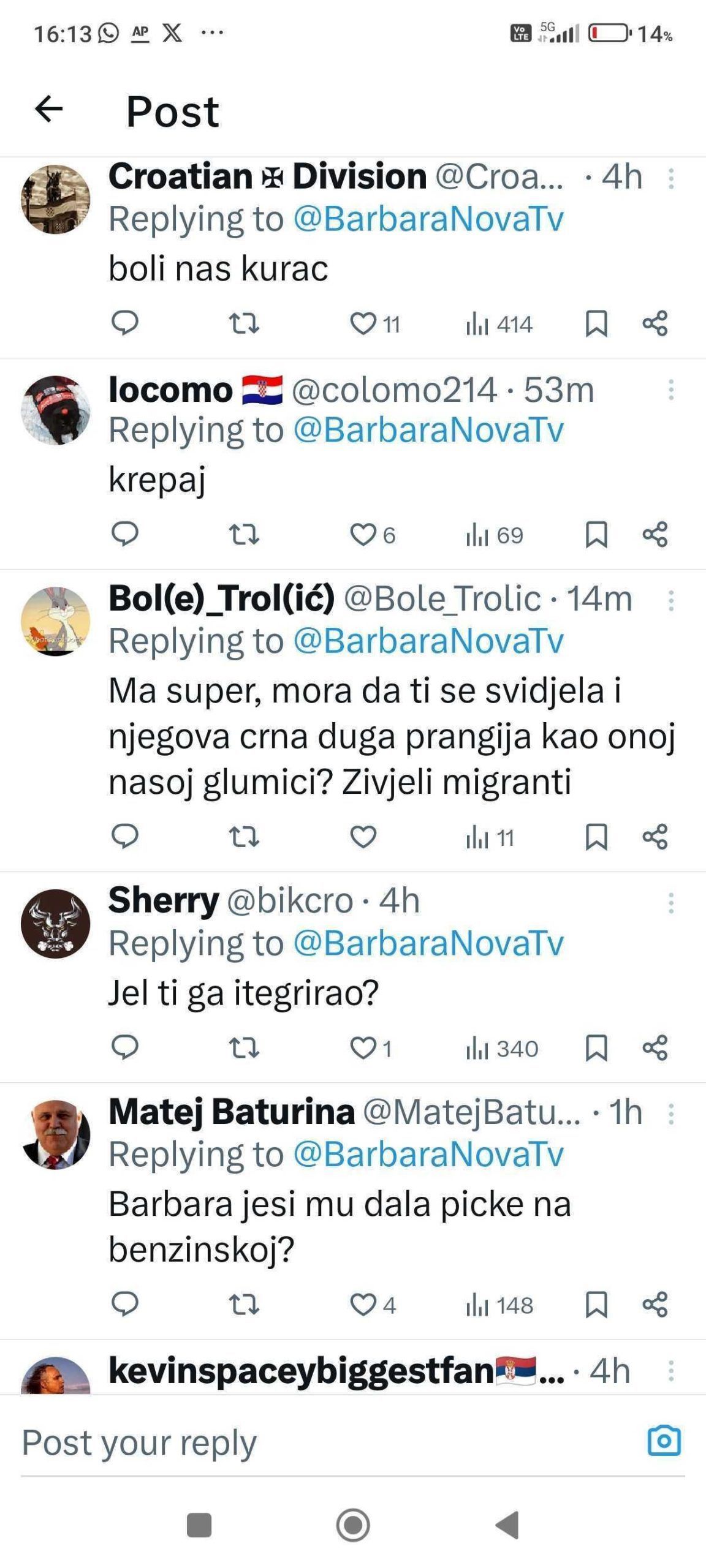 U izjavi za medije, Barbara Štrbac osvrnula se na količinu mržnje koju je izazvala njezina jednostavna priča. “Velika većina ‘junaka’ koji su imali potrebu moj status popratiti negativnim komentarima i govorom mržnje skrivaju se iza nadimaka i nisu na X-u imenom i prezimenom. Začudila me količina komentara s seksualnim konotacijama, ali to više govori o njima nego o meni”, izjavila je.