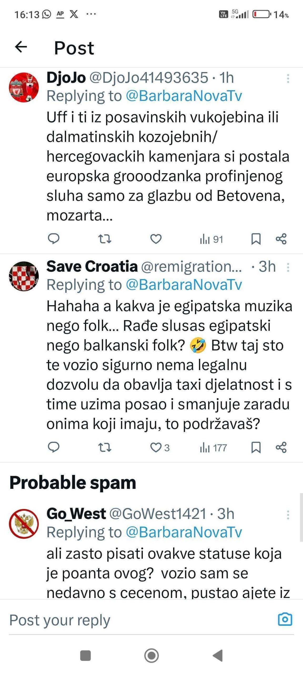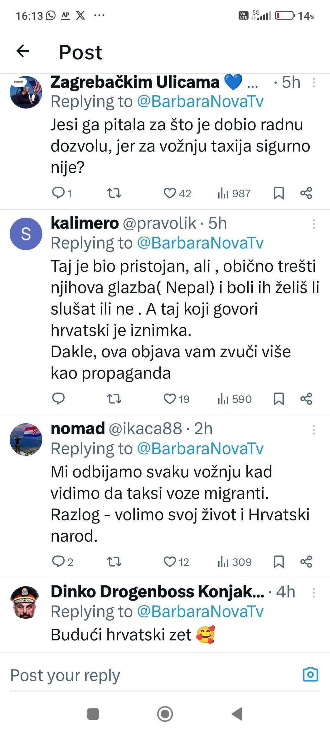 Novinarka i reporterka Nove TV, Barbara Štrbac, podijelila je svoje iskustvo vožnje taksijem u Zagrebu, što je izazvalo lavinu komentara na društvenoj mreži X. U objavi, Barbara je ispričala kako ju je u subotu navečer vozio mladi Egipćanin, koji je na njezin zahtjev pustio svoju omiljenu egipatsku glazbu, što ga je, prema njezinim riječima, vidno razveselilo.