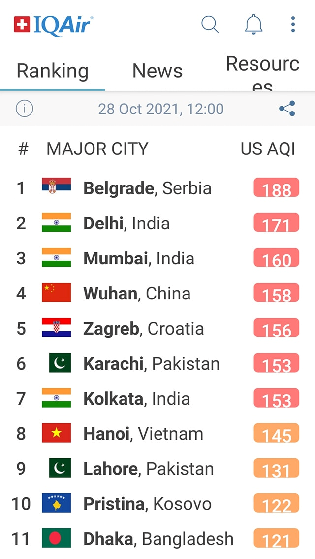 Ovi gradovi su trenutno u crvenoj zoni, što znači da je zrak nezdrav i opasan po zdravlje građana.