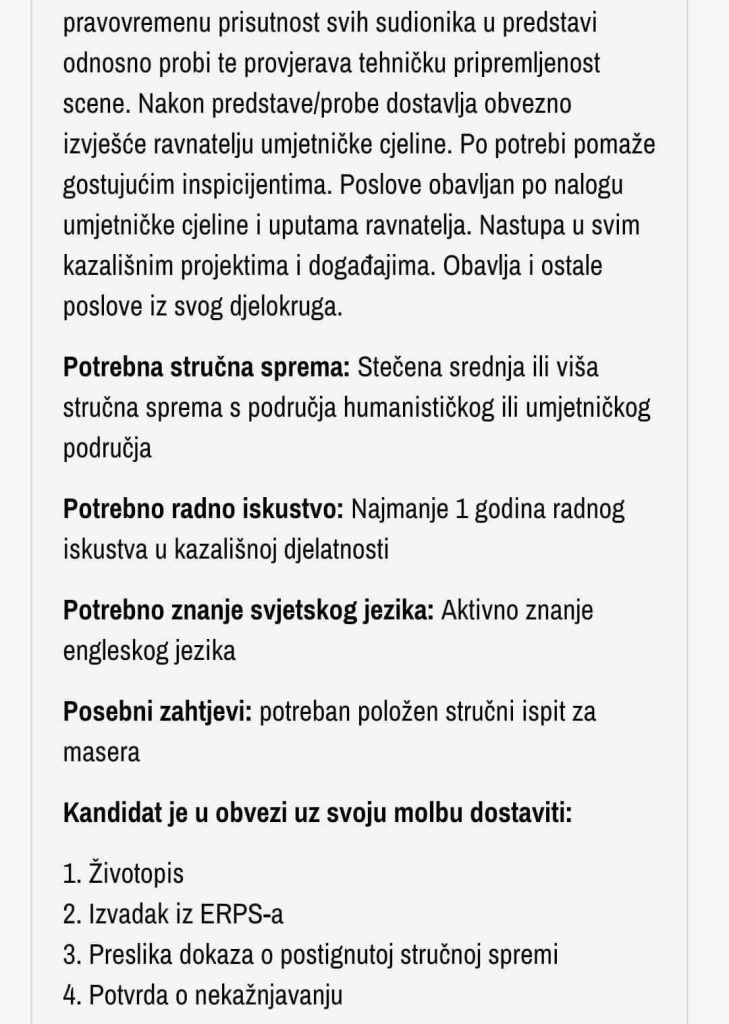 Naime, Hrvatsko narodno kazalište Ivan pl. Zajca traži inspicijenta, odnosno inspicijenticu.