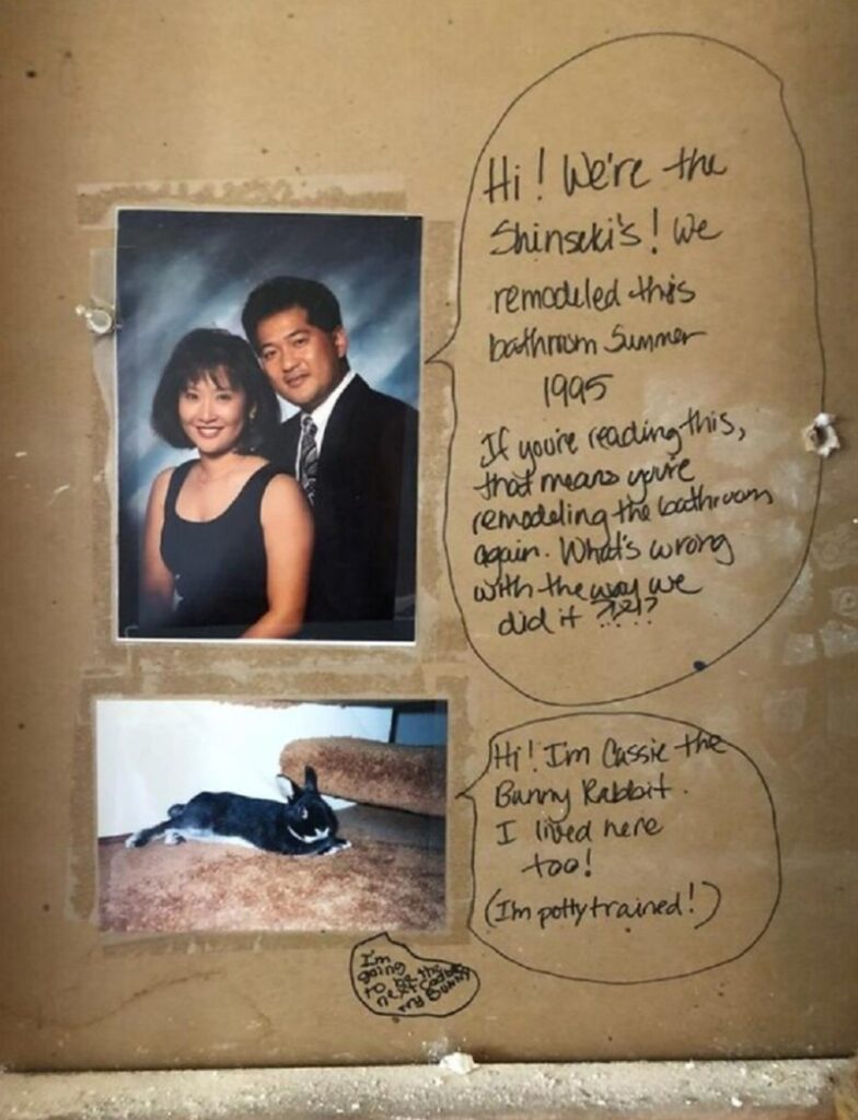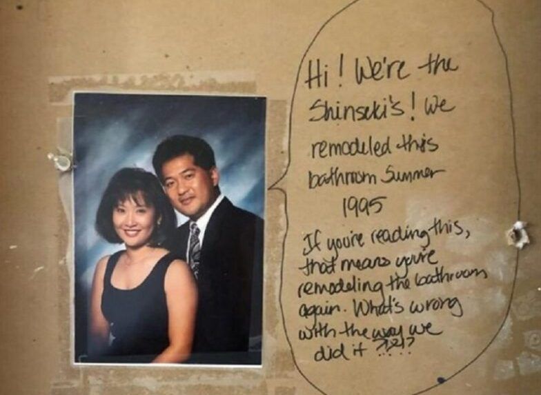 – Zdravo! Mi smo Shinseki. Kupaonicu smo renovirali u ljeto 1995. Ako ovo čitate, znači da ponovno obnavljate kupaonicu. Što smo pogriješili? – stoji u poruci uz fotografiju bračnog para koji je nekada živio u kući.