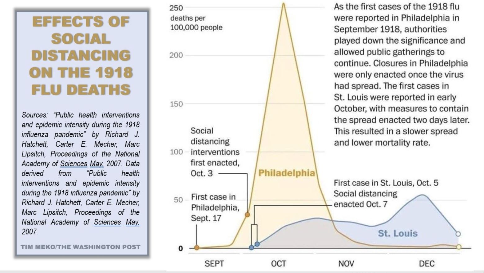 Na primjeru Philadelphije i St.Louisa možemo vidjeti razliku u timingu mjera socijalnog distanciranja u prvom valu zaraze. Drugi val je bio daleko pogubniji jer je virus mutirao, a najveće žrtve su bili mladi ljudi. Prvi slučajevi zaraze u Philadelphiji otkriveni su 17. rujna, a prve mjere laganog socijalnog distanciranja krenule su tek 3.listopada. Nakon toga dolazi do eksplozije smrtnosti jer se virus toliko raširio da je morao odraditi svoje. Teško je ljudima naviklim na normalnu sezonsku gripu resetirati mozak i natjerati na drukčije socijalno ponašanje.