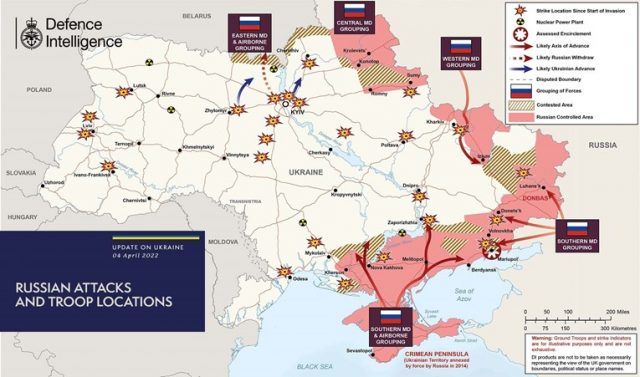 The map below is the latest Defence Intelligence update on the situation in Ukraine – 04 April 2022