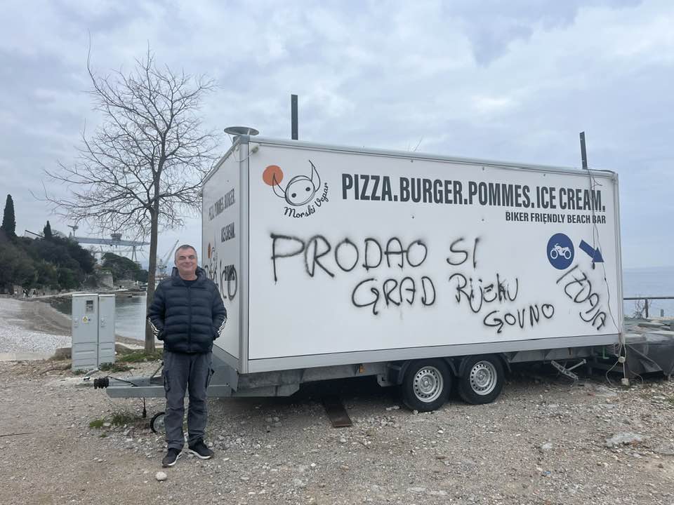 Poznati riječki ugostitelj i poduzetnik u kulturi Damir Čargonja Čarli objavio je danas na facebooku fotografiju pošaranog ugostiteljskog kontejnera pored plaže ‘Morski Prasac’. Na kontejneru je anonimni vandal našarao’Prodao si grad Rijeku’, ‘g*vno’ i ‘izdajnik’ što je Čarli prokomentirao statusom: ‘Vrati se u Afriku’.