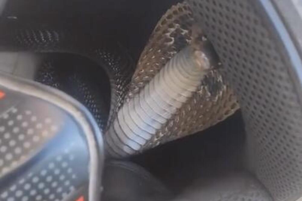 Isprva je teško primijetiti kobru, jer njezini uzorci odgovaraju poklopcu kacige. Detalji priče nisu poznati, a snimka je u kratkom roku pogledana više od 4,2 milijuna puta, javlja NDTV.