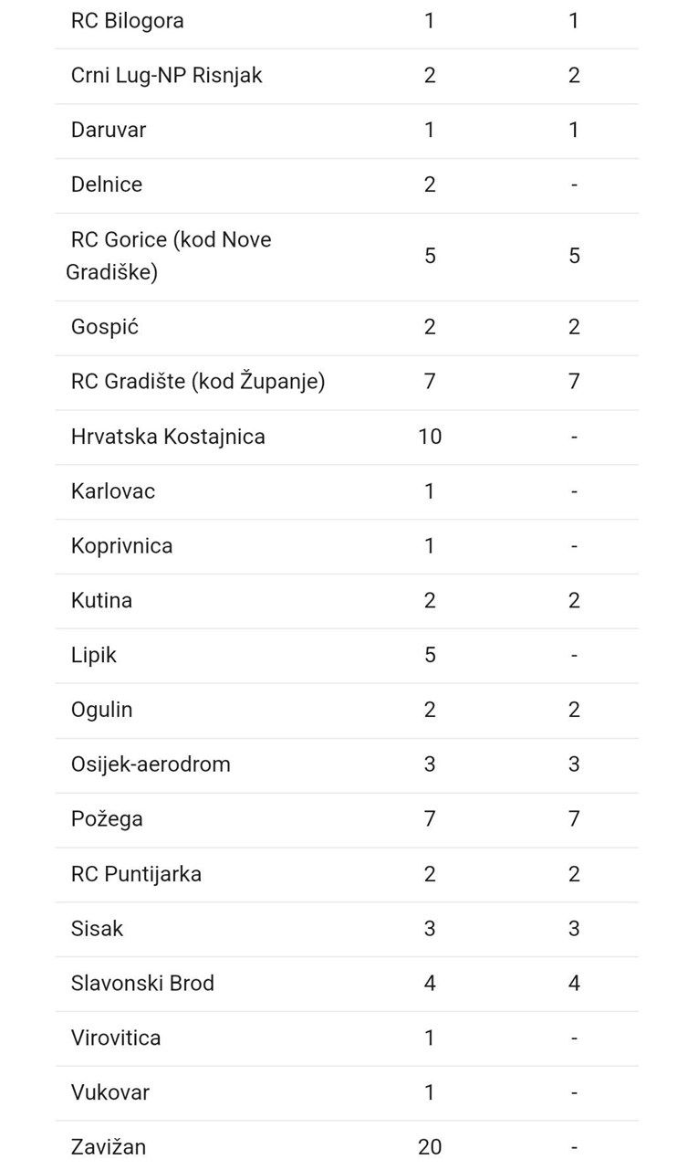 Trenutne visine snijega u Hrvatskoj variraju ovisno o regiji, pri čemu lijevi stupac označava ukupnu količinu snijega, a desni novi snijeg koji je pao.