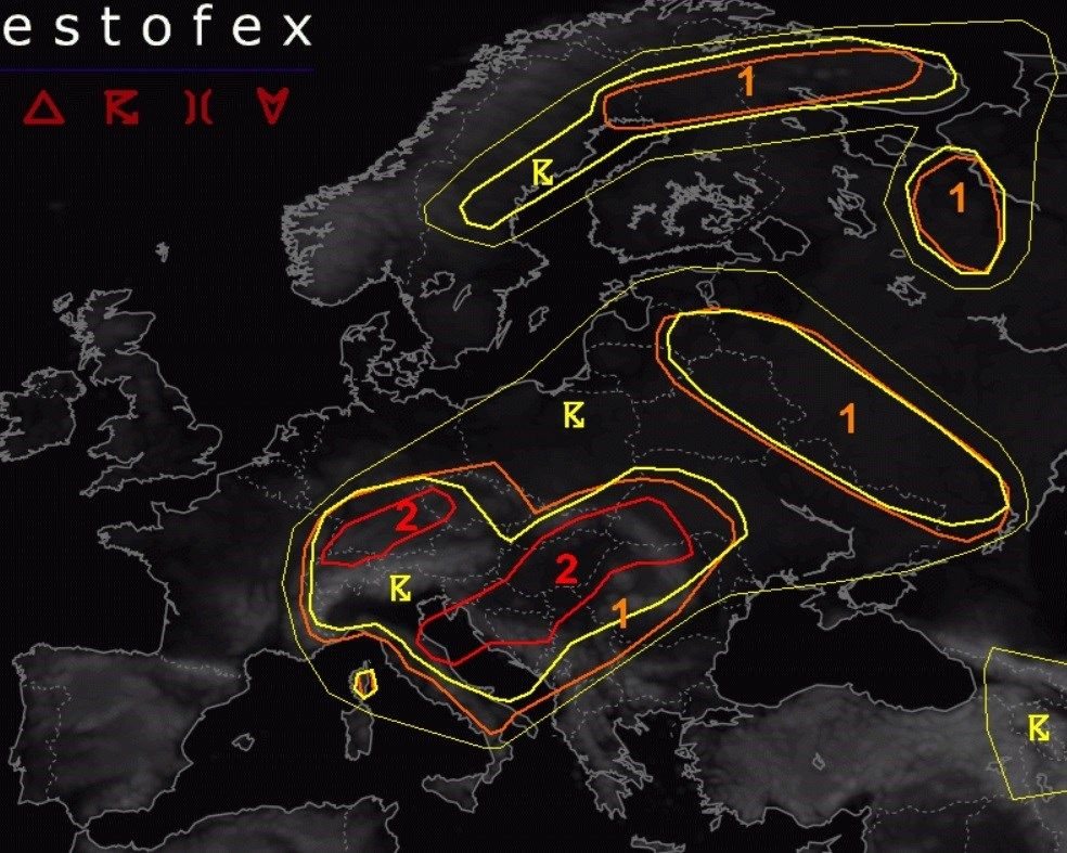 Upozorenje je izdao i Estofex, europski sustav za praćenje oluja, koji predviđa mogućnost razvoja superćelijskih oluja – snažnih i organiziranih grmljavinskih sustava. Te oluje mogu donijeti krupnu tuču, olujne udare vjetra i obilne količine kiše. Razvoj prvih takvih sustava očekuje se već u ranim popodnevnim satima, najprije iznad Italije, a zatim će se preko Jadrana premještati prema hrvatskoj obali.