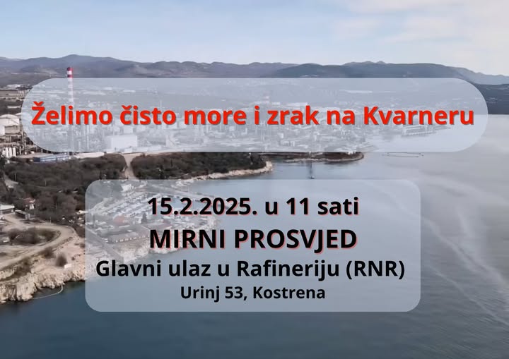 Eko Kvarner i Građanska inicijativa Čuvari Kvarnerskog Zaljeva organiziraju mirni prosvjed s ciljem zaštite Kvarnera od štetnog utjecaja industrijskih aktivnosti. Prosvjed će se održati u četvrtak, 15. veljače 2025. godine, s početkom u 11 sati ispred Glavnog ulaza u Rafineriju nafte Rijeka (RNR) na adresi Urinj 53, Kostrena.