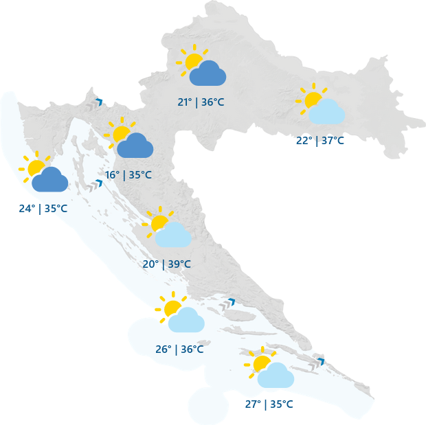 Jutarnje temperature zraka kretat će se između 18 i 23°C, dok će na obali i otocima biti toplije, između 23 i 28°C. Najviša dnevna temperatura uglavnom će se kretati od 30 do 35°C, dok će u Gorskoj Hrvatskoj biti nešto niža.