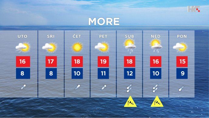 Mjestimice još viša u također pretežno sunčanoj Dalmaciji, osobito u unutrašnjosti, gdje će u noći i ujutro biti prolazno više oblaka. Nakon uglavnom burina, na otvorenome i umjerenog sjeverozapadnog vjetra, zapuhat će maestral, uz koji će more biti malo do umjereno valovito i na većinom sunčanome jugu Hrvatske. Temperatura ujutro 5 do 10 °C, a poslijepodne oko 17 °C.