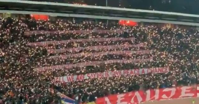 Cijeli sjever stadiona osvanuo je u bljeskovima mobitela, a vidjeli su se i brojni transparenti na kojima su godine i mjesta gdje se ratovalo za vrijeme 20. i 21. stoljeća. Između ostalih, Delije su istaknule Jugoslaviju (1999.), Republiku Srpsku (1995.), Sudan (1998.), Filipine i Libiju, a sve su to popratili porukom: