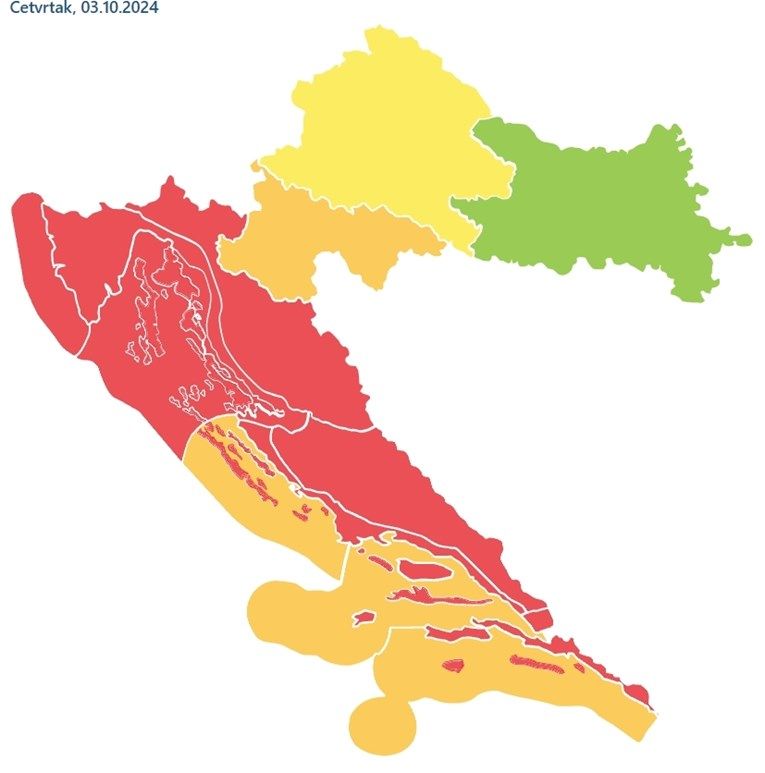 Crveni alarm aktiviran je za gospićku i riječku regiju te područja zapadne obale Istre, Kvarnera, Kvarnerića i Velebitskog kanala.