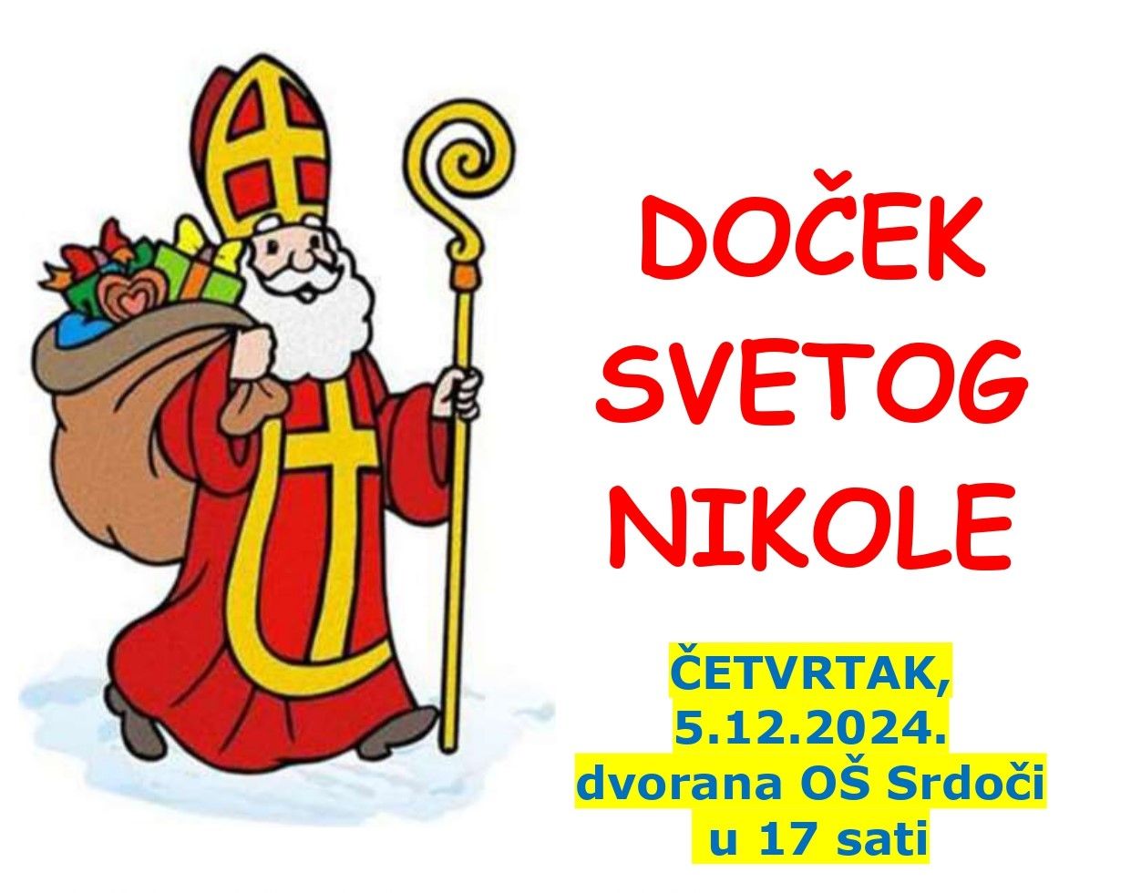 🎅 U četvrtak, 5. prosinca 2024., s početkom u 17 sati, u dvorani OŠ Srdoči, održat će se tradicionalni Doček Svetog Nikole u organizaciji Mjesnog odbora Srdoči.