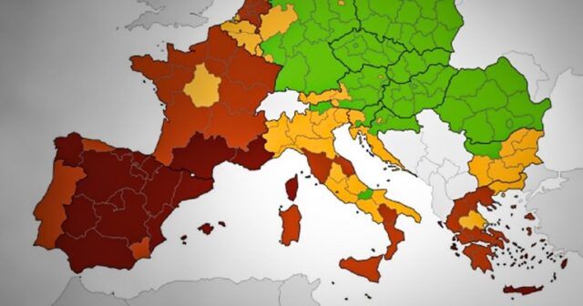 U Italiji je samo jedna regija ostala u zelenom, dok su ostale ili u narančastom ili u crvenom. Grčka je većinom u crvenoj zoni, dok je jug zemlje u tamno crvenoj.