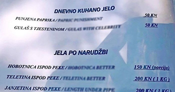 Pogledajte samo kako su sva jela prevedena na engleski jezik, svako je toliko pogrešno, a opet toliko urnebesno da se ne možemo prestati smijati 😂