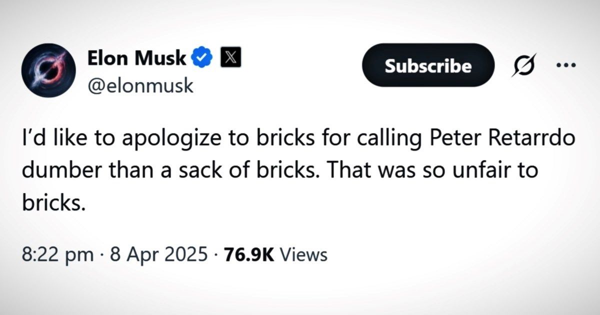 “Želio bih se ispričati ciglama što sam Petra Retarrda nazvao glupljim od vreće cigli. To je bilo tako nepravedno prema ciglama”, napisao je Musk, odgovarajući na jednu od objava o Navarru.