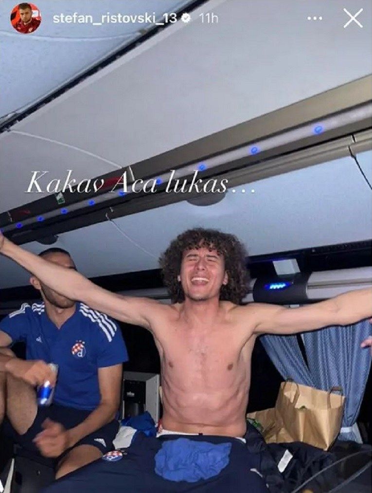 Usred Like slavlje igrača i navijača vodio je Stefan Ristovski, a jedan od najomiljenijih igrača Dinama pokazao je na Instagramu kakva je bila atmosfera u klupskom autobusu na povratku iz Splita u Zagreb. Igrači su i u njemu slavili, a Ristovski je objavio kako u zanosu izgleda Robert Ljubičić, još jedan miljenik navijača Dinama. Uz fotografiju Ljubičića kako gol do pasa pjeva raširenih ruku Ristovski je napisao “Kakav Aca Lukas…”