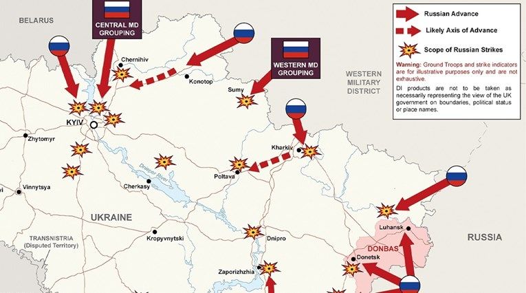 Britansko Ministarstvo obrane piše da se ilegalna i ničim izazvana invazija Ukrajine nastavlja. U objavi na Twitteru dodali su i kartu koja prikazuje ruske položaje i smjer napada.