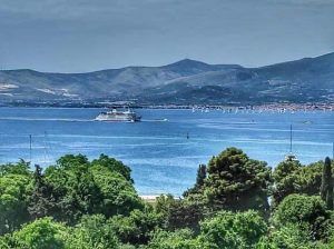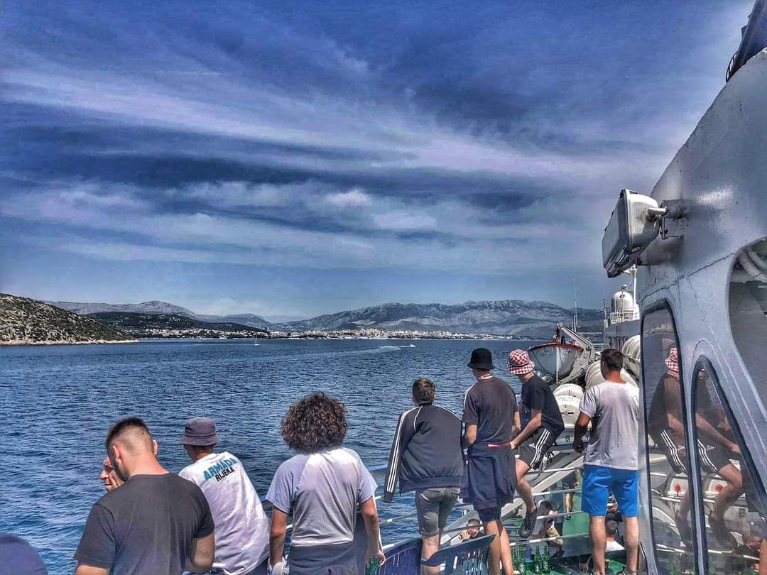 Bijeli brod uplovljava u splitsku luku. Oko 1000 navijača Rijeke u Split dolazu morskim putem.