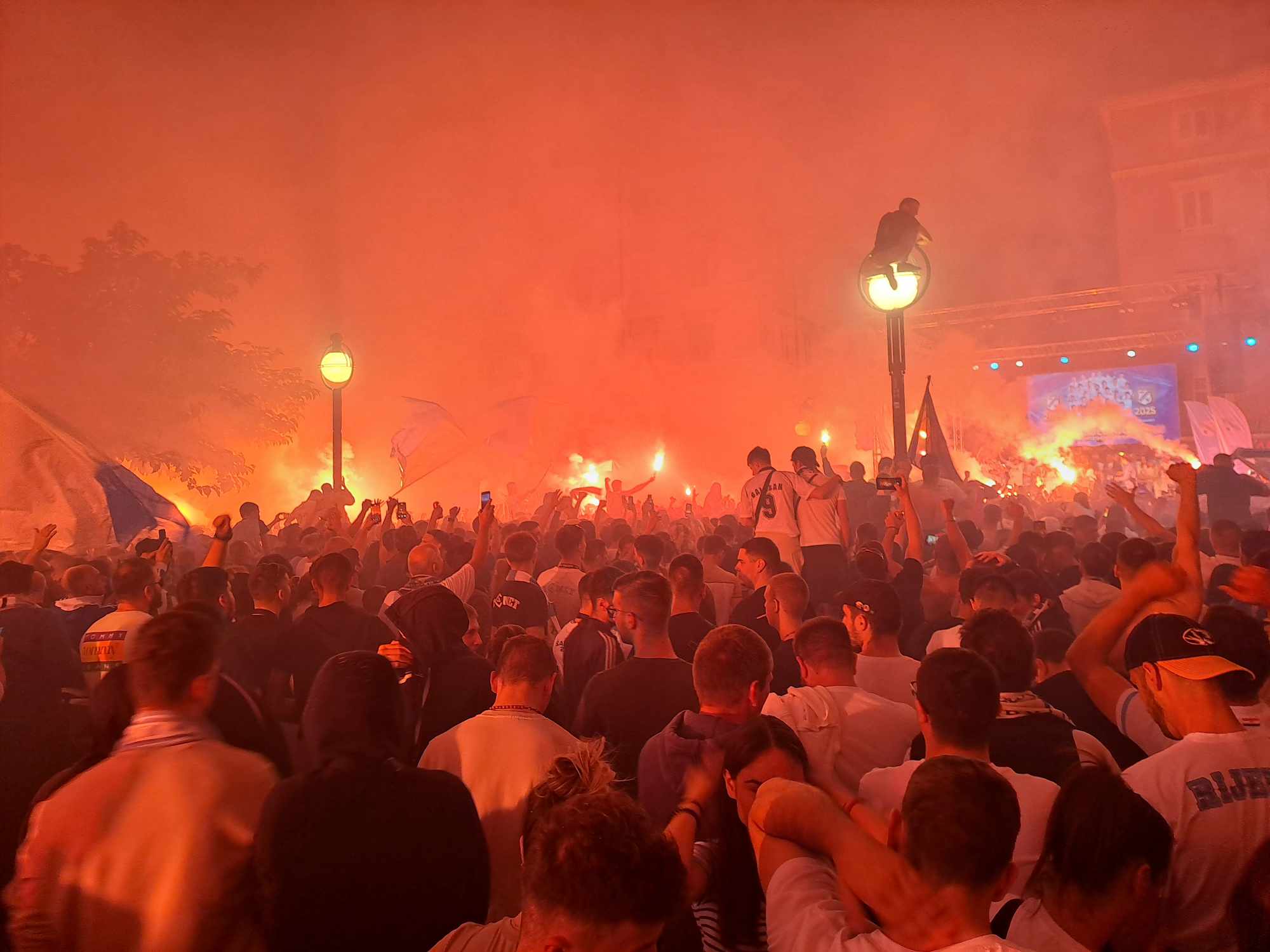 Stigla je najava koju su svi čekali: “Dečki su krenuli… na Potoku… Parkirali kod Bonavije”. Bio je to znak da nogometaši HNK Rijeke kreću prema pozornici na Korzu, gdje ih je čekalo tisuće navijača.
