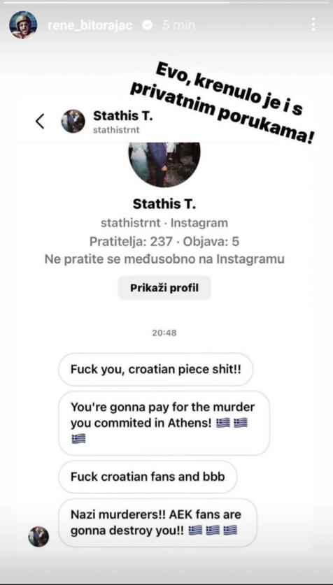 ‘Je** se, hrvatsko govno. Platit ćeš za ubojstvo koje si počinio u Ateni. Jebeš hrvatske navijače i BBB. Nacističke ubojice! AEK-ovi fanovi će vas uništiti’ – napisao je na Instagramu glumcu Reneu Bitorajcu jedan Grk.