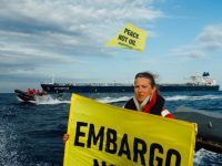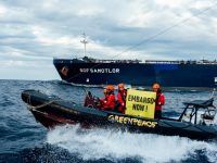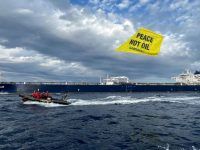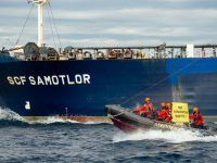 U nedjelju popodne Greenpeaceov brod Rainbow Warrior prosvjedovao je ispred tankera SCF Samotlor koji je prevozio rusku naftu u luku Omišalj.