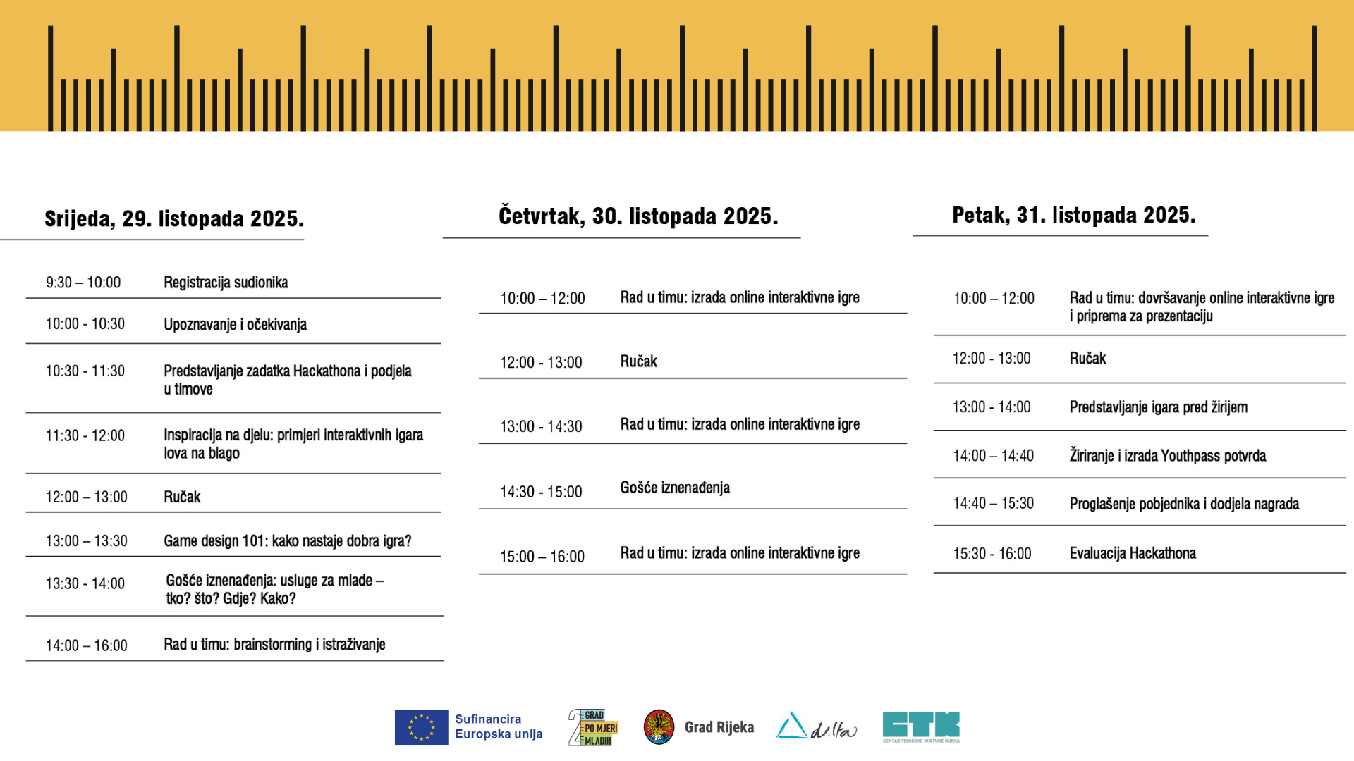 Hackathon će se održati od 29. do 31. listopada, svakog dana od 10 do 16 sati, u Centru tehničke kulture Rijeka na adresi Školjić 6. Tijekom tri dana sudionici će imati priliku surađivati, učiti i razvijati vlastite ideje pod vodstvom iskusnih mentora.