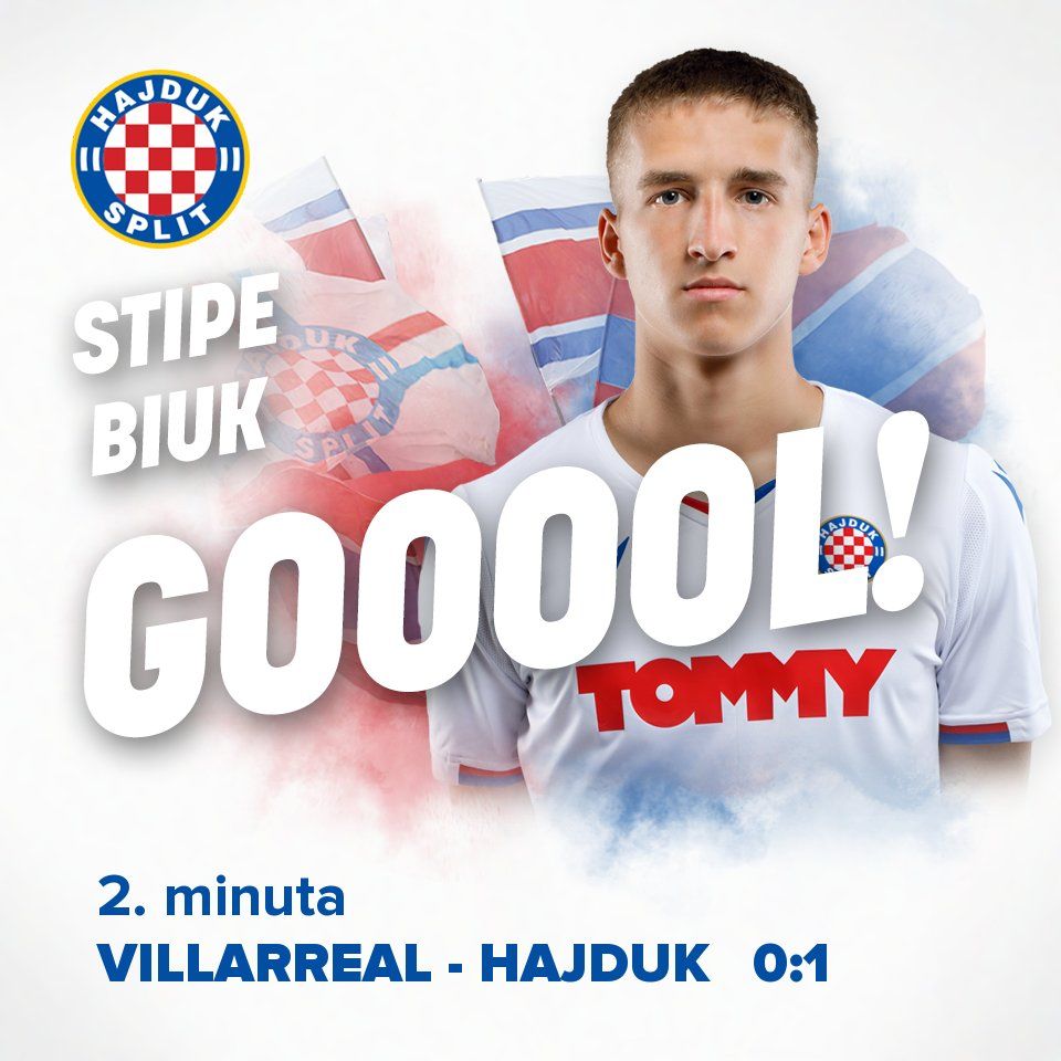 Hajduk vodi 1:0! Strijelac je Stipe Biuk. Marko Livaja je povukao napad i gurnuo loptu prema golu, dirao je to jedan igrač Villarreala i lopta je došla do Biuka koji pogađa za vodstvo Hajduka.