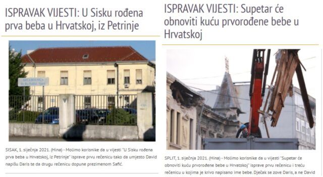 HINA je danas, 1. siječnja objavila članak “U Sisku rođen prva beba u Hrvatskoj, iz Petrinje” u kojem je, nažalost, krivo navedeno da se dječak zove David, a točno je da se zove Daris, što smo naknadno ispravili. Do greške je došlo jer je Hininom honorarnom suradniku iz Sisak izvor iz bolnice dao krivi podatak o imenu. U tom trenutku izvor nije otkrio prezime dječaka i njegove obitelji niti njihovu nacionalnost nego je samo potvrdio da je porod prošao dobro, da se majka i beba dobro osjećaju. Izvor je otkrio i teške okolnosti u kojima se ta obitelj nalazi, odnosno da je riječ o četveročlanoj obitelji koja je neko vrijeme provela u osobnom automobilu jer im je porušena kuća u Petrinji. Sve to naš suradnik je odmah napisao, a HINA u prijepodnevnim satima i objavila.