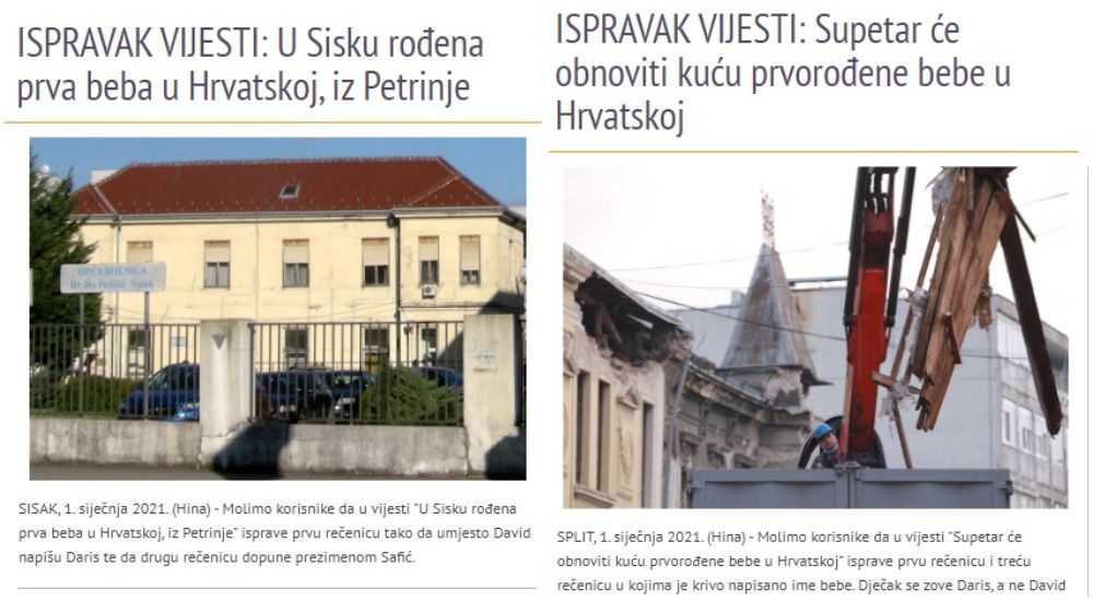 Na tekst HTV I HINA zbog nacionalnosti prešutjeli ime prve bebe rođene ove godine u Hrvatskoj!?, reagirali su iz HINA-e. Naime u jutrošnjoj objavi HINA-e, koju su preuzeli drugi mediji, tvrdilo se da se prvorođena beba u 2021. godini zove David. Otac djeteta Ferid Safić je, uz konstataciju da mu je to važno, od medija jutros zatražio da isprave pogrešnu informaciju i u izvještajima bebu nazovu pravim imenom – Daris. Iza 20 sati ispravak svoje informacije objavila je napokon i HINA od koje je cijela priča i krenula. Njihov zahtjev za objavu ispravka našeg današnjeg teksta prenosimo u cijelosti: