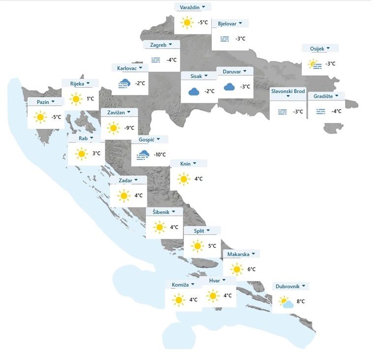 Jutros u Hrvatskoj temperature su se spustile ispod nule u gotovo cijeloj kontinentalnoj Hrvatskoj, dok je najhladniji bio Gospić s -10 °C. Varaždin je slijedio s -5 °C, a ostatak unutrašnjosti također je u minusima.