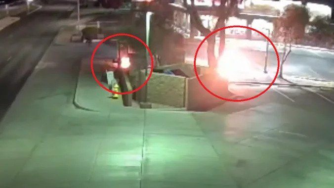 Snimka kamere prikazuje Angerera i svjedoka kako trče prema obližnjoj trgovini dok pokušavaju ugasiti vatru.